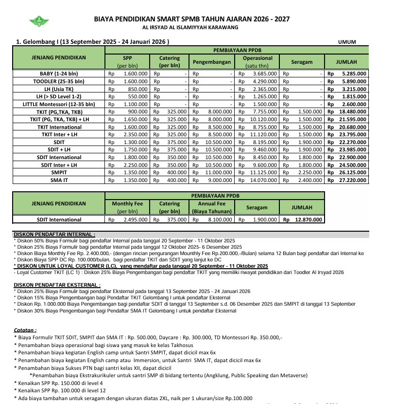 - Loyal Customer SMPIT (LC 2) : Diskon Biaya Pengembangan Rp. 3.750.000,-, *bagi pendaftar ke SMPIT Al Irsyad dari Internal yang memiliki riwayat pendidikan Bersekolah berkelanjutan dari TKIT - SDIT Al Irsyad Karawang